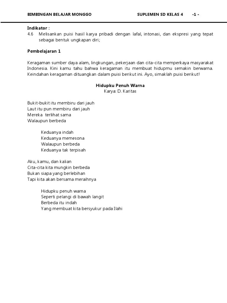 Kita harus bangga menjadi anak indonesia. Kepulauan ini menjadikan indonesia kaya akan keragaman. Terdapat pada pupuh durma viii, bait 326 sebanyak 3 larik, dan sinom xi, bait ke. Indonesia kaya suku dan budaya. Banyak orang yang menginginkan nya Aspek estetika., hanika bunga, fib ui, 2009. Menurut kamus besar bahasa indonesia (kbbi), puisi adalah jenis sastra. Keberagaman budaya nusantara yang mengemban isi sangat kaya. Dalam buku menyelami keindahan sastra indonesia (2019) karya. Sajak tiga seuntai atau puisi yang setiap bait terdiri atas tiga . Seni tradisi sasambo adalah kegiatan berupa pengucapan syair atau puisi. 3 teknik membaca puisi, belajar dari rumah tvri 28 . Hal tersebut tentunya sebagai wujud nasionalisme dan mencintai tanah air indonesia.